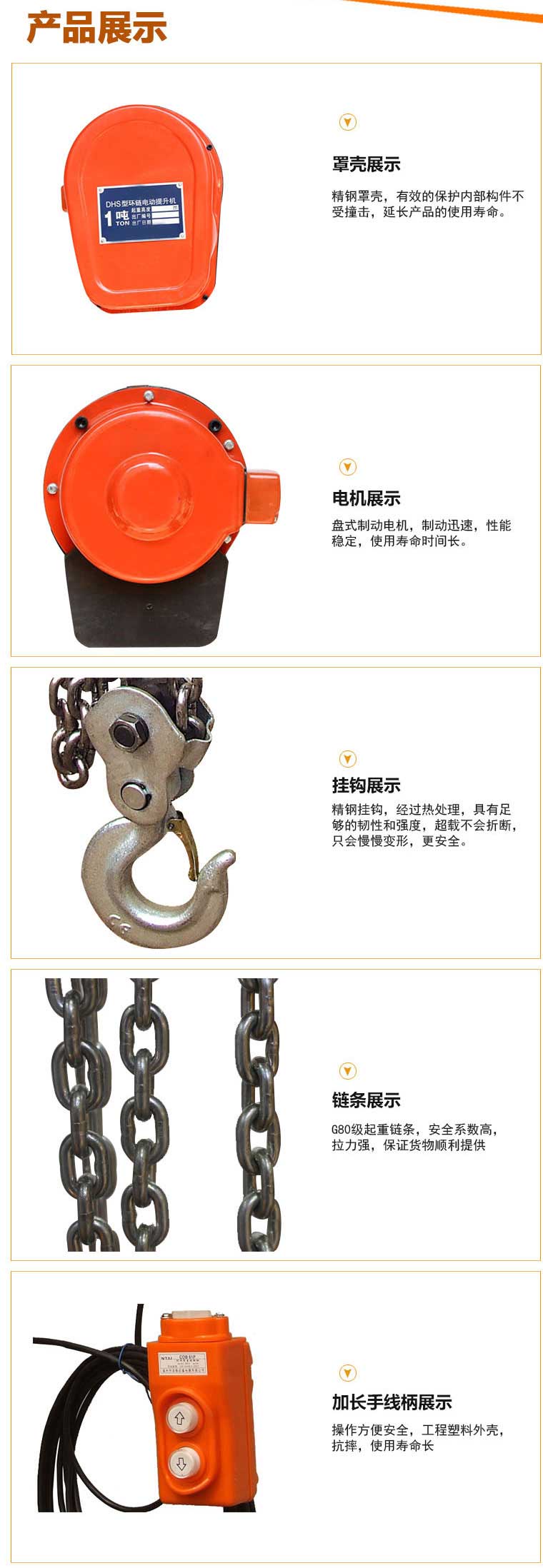 5、極限開關:吊上吊下都有極限快關裝置,使電機自動停止,反防止鏈條超出,確保安全。