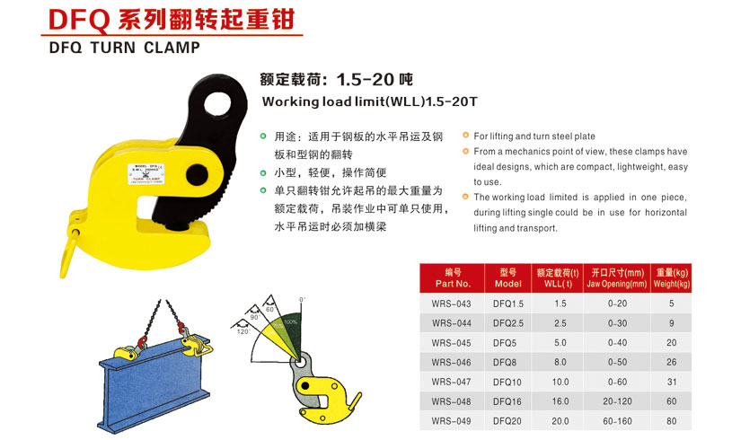 DFQ型翻轉吊鉗適用于鋼板水平吊裝、豎直吊裝和型鋼的翻轉,此類起重鉗采用首鋼低碳優質合金鋼制造,強韌耐久,易操作。更適于h鋼翻轉(由H狀—I狀,I狀—H狀),載荷范圍:0-5噸。DFQ型翻轉鋼板吊鉗以單只試驗為額定載荷,吊裝作業時單只使用,水平吊裝時,必須加平衡梁,在吊裝過程中不得碰撞被吊物,嚴禁超載使用。本產品嚴格按國家3包執行,產品質量由中國人民保險公司(PICC)承保,請放心使用。