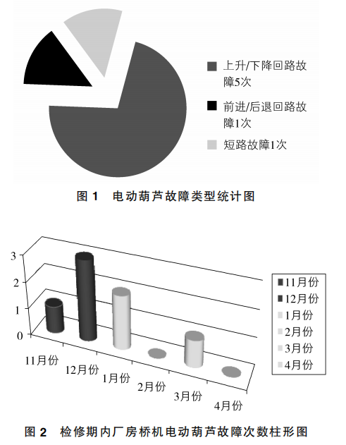 通過(guò)對(duì)2013-2014年檢修期電動(dòng)葫蘆故障類(lèi)型統(tǒng)計(jì)及檢修期內(nèi)廠房橋機(jī)電動(dòng)葫蘆故障次數(shù)柱形圖的調(diào)查分析得出:上升/下降控制回路故障次數(shù)為5次,前進(jìn)/后退控制回路故障1次,短路故障1次,由此可見(jiàn),電動(dòng)葫蘆控制回路的可靠性有待進(jìn)一步提高。下面就對(duì)電動(dòng)葫蘆的一些常見(jiàn)故障原因進(jìn)行分析、探討。
