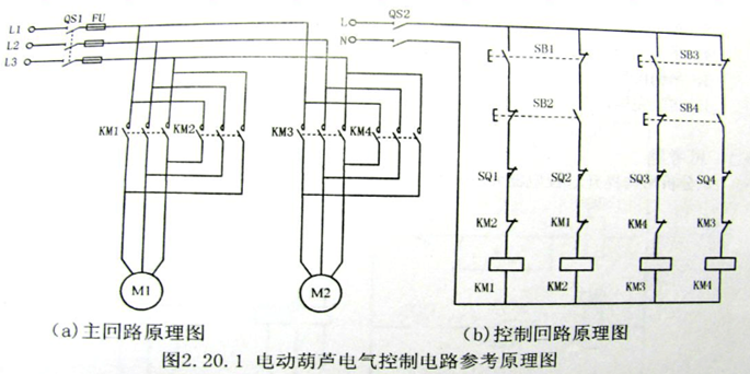 2、吊鉤提升:控下SB1,觀察并記錄各電機和接觸器及行程開關的運行情況。