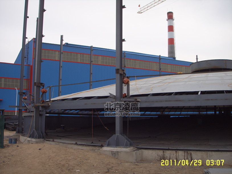 施工要點:每圈壁板的預(yù)制長度為凈料長度加300-500mm;罐底板、頂層兩圈壁板及灌頂?shù)氖┕ぞc常規(guī)施工方法一致;內(nèi)擋板的設(shè)置:壁板施工前,在罐底板上放出罐體內(nèi)徑大圓,沿圓周內(nèi)側(cè)在罐底板上點焊內(nèi)擋板。內(nèi)擋板尺寸為100mm*100mm*8mm,沿圓周每隔1.5m設(shè)一個;圍板、立縫組對:采用毛料組對,壁板與壁板間的立縫在調(diào)好間隙后直接點焊。一般每圈板留兩道活口。圍板后在每道立縫后面插入鋼筋作為反變形支承,活口處用手拉葫蘆預(yù)緊;立縫焊接:壁板組對后即可焊接,但活口處的立縫暫不焊。要求雙面焊的立縫,其內(nèi)側(cè)可在提升后進行焊接;提升:立縫焊完后,檢查提升機具設(shè)置無誤,即可開始提升。先逐個起動電動葫蘆,使每個葫蘆的負載基本一致,再集中啟動全部葫蘆進行提升,提升時罐內(nèi)人員觀察各電動葫蘆的運行情況,防止卡鏈,提升至距對接口150-200mm位置時暫停提升,進行下一步工作;罐壁擋板設(shè)置:在所提升的壁板下端沿圓周每隔1.5m設(shè)置一個罐壁擋板,尺寸為120mm*60mm*8mm;再提升、環(huán)縫組對:啟動全部電動葫蘆,使罐體提升到位,逐漸將活口收緊,使下圈壁板上端緊貼罐壁擋板,下端緊貼罐底內(nèi)擋板,局部不到位的地方用刀形板和方銷子調(diào)整到位,環(huán)縫間隙用電動葫蘆調(diào)整,并進行組對點焊;封口機環(huán)縫環(huán)節(jié):罐壁的環(huán)縫組對后,割去多余的壁板,坡口打磨后進行點焊,焊接前應(yīng)在背面設(shè)防變形弧板,然后進行環(huán)縫焊接;最后一圈壁板安裝:仍按上述方法進行,但需留一張板的立縫不焊,待環(huán)縫組對后,在此開出大門,撤出罐內(nèi)的倒裝機具,再封大門并焊接。