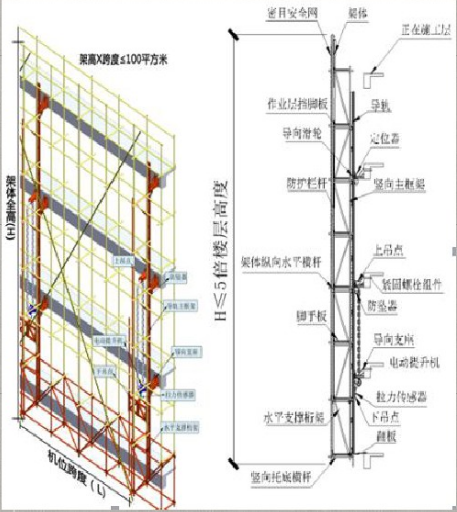 導軌式爬架的性能指標:架體高度0.9m,架體高度14.4m。離墻距離0.4-0.6m。升降速度9cm/min,架體步高及柱距1.8m。附著最大間距7.2m。